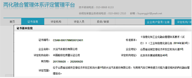 6月20日,Z6·尊龙凯时汽车股份有限公司荣获工信部颁发的两化融合管理体系评定证书(证书编号CSAIII-00617IIIMS0012401 )。